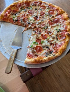 Sausage, pepperoni, mushroom, green peppers, onions, double cheese, tomato sauce.